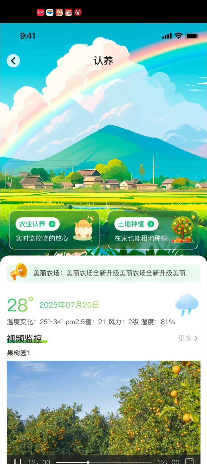 家禽、果树三大认养场景,7×24小时高清直播覆盖种植/养殖农事的全周期,认养者可实时查看土壤温湿度、
