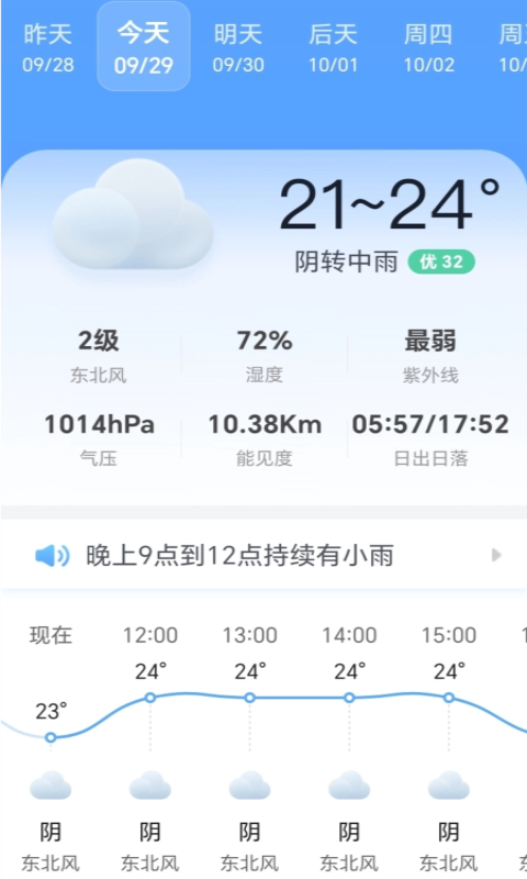 精准可靠: 预报精准到小时和公里范围,温度、风雨预报值得信赖。