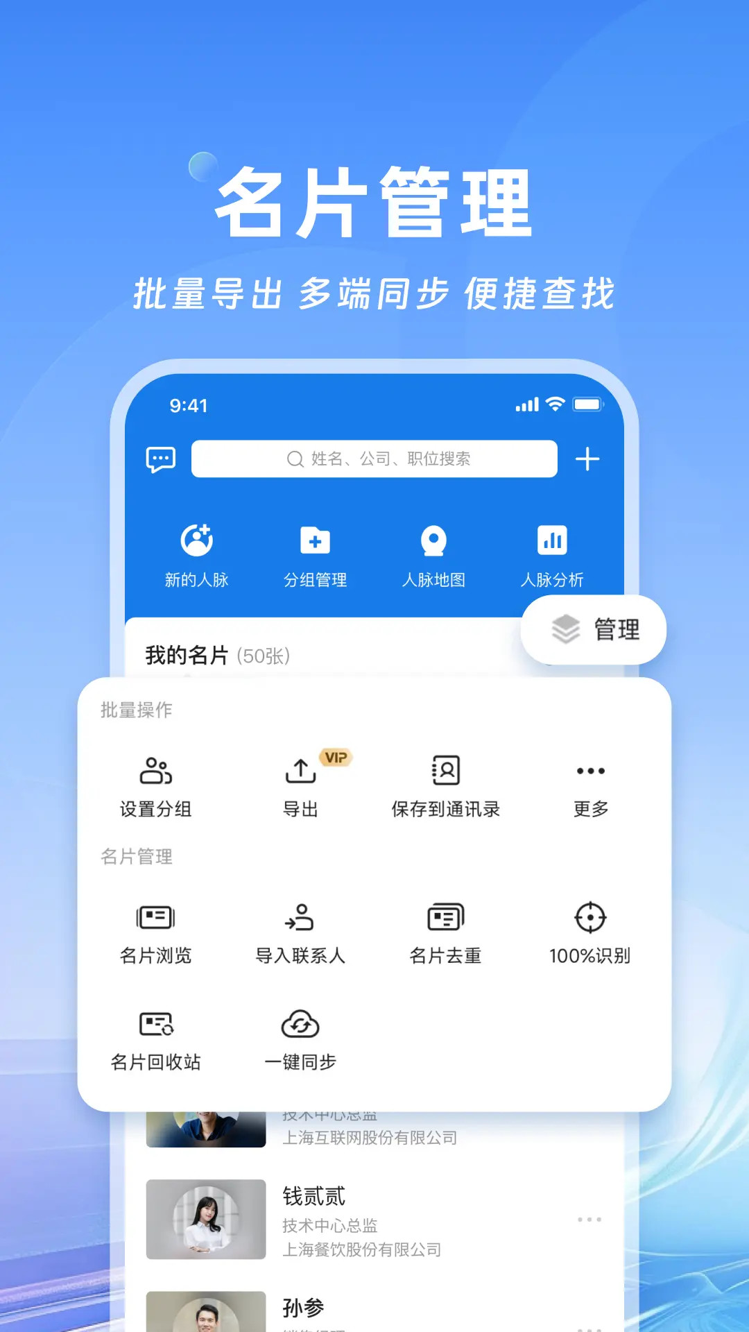 从纸质名片扫描管理、数字名片多渠道分享、拓展商务人脉,到查找、评估、联系企业,名片全能王助您建立更高效的商业连接。
