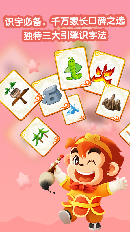 《悟空识字》是一款专注于汉字启蒙的产品,包含1500个常用汉字,5500+常用词句,75本原创绘本。我们用经典名著西游故事,串联识字过程,提升孩子识字兴趣,强化汉字应用场景。