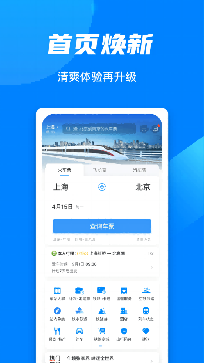 提供高铁订餐、酒店预订、约车接送站、铁路游、景区门票预订、铁路商城、出行保险等服务,吃住行游购娱,一款APP满足您的出行需求。