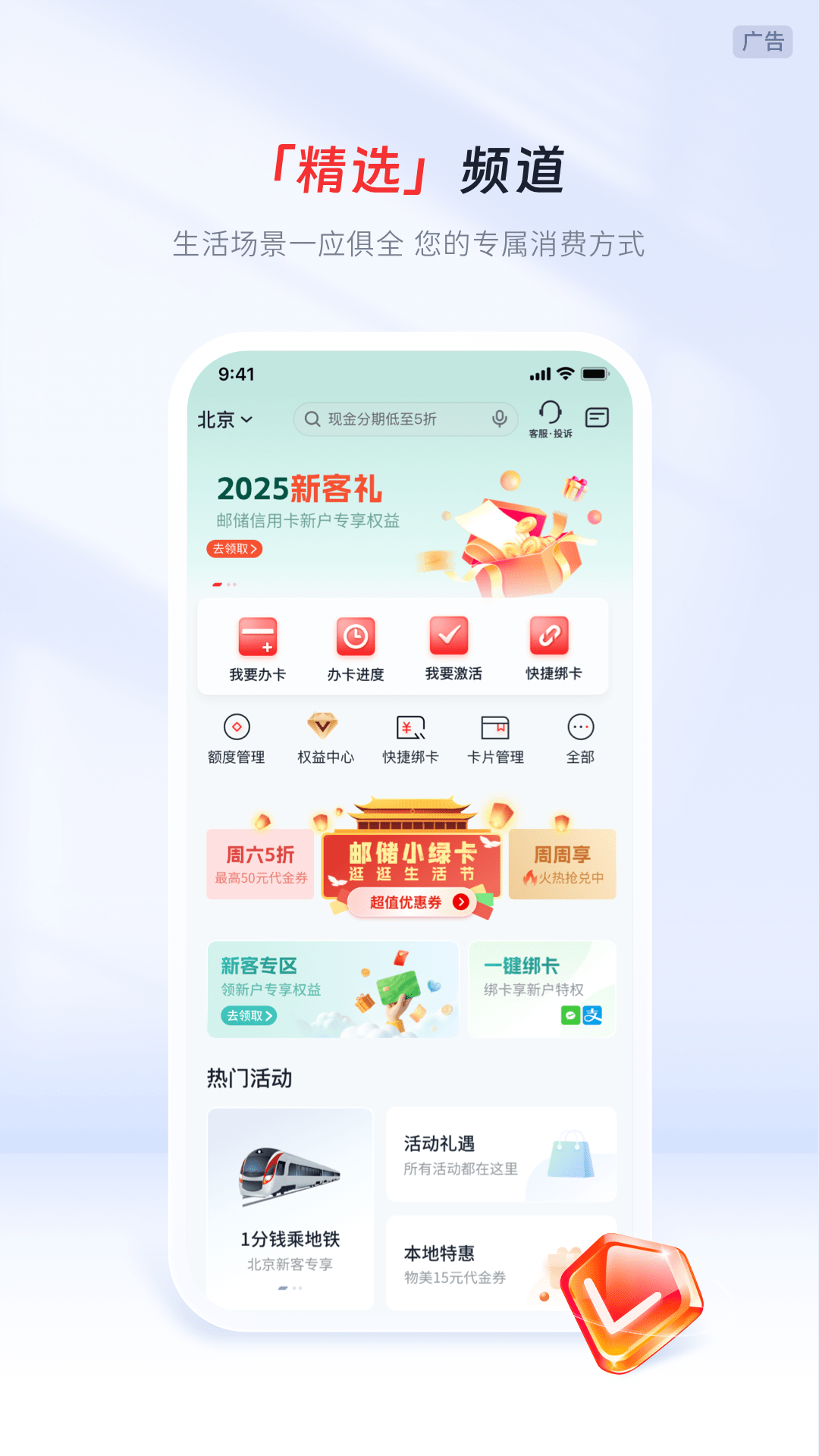 【精选】:生活场景一应俱全,“邮储小绿卡逛到就省到”、活动礼遇、选卡专区等更多精彩享不停。