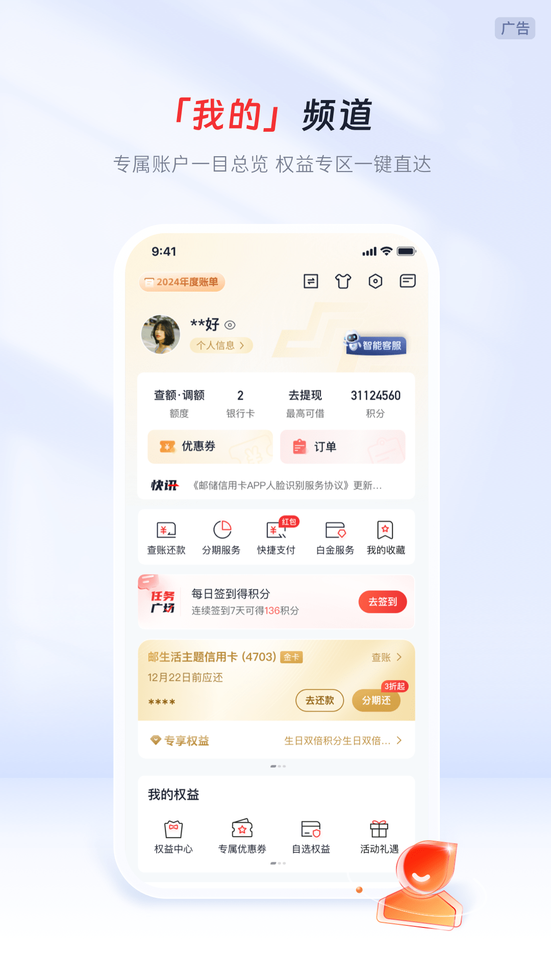 邮储信用卡APP由中国邮政储蓄银行官方出品,秉承“进步与您同步”的理念,为您提供安全、便捷、多样的网上自助金融服务,是一款汇集生活、消费、金融服务为一体的综合服务平台。邮储信用卡APP分五个模块:精选、享积分、惠生活、信用卡、我的,可提供账单查询、还款、积分兑换、分期申请、额度管理等金融功能,加油洗车、爱车养护、影票购买、话费充值、美食商圈等生活场景服务,更有白金服务、原创主题、大字版、语音搜索等特色服务。