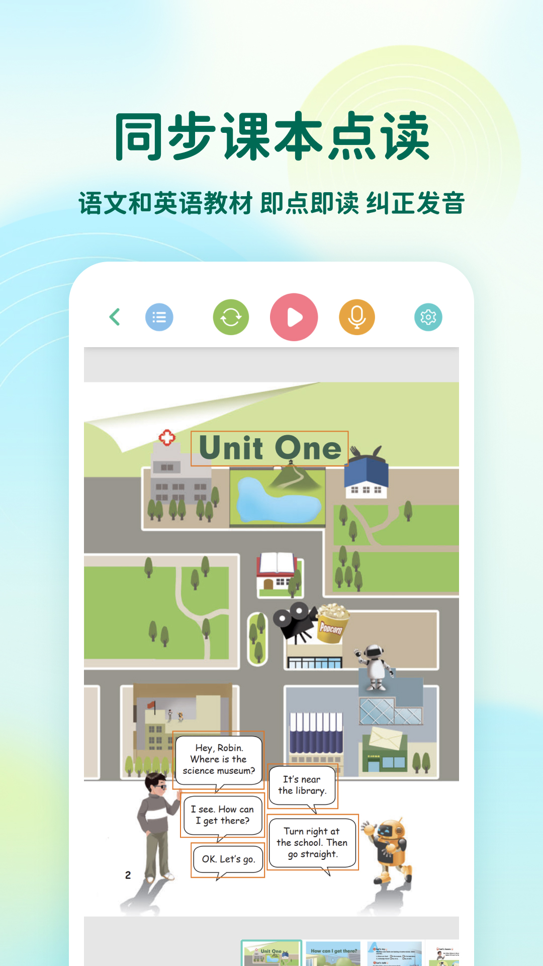 2、课本点读:同步教材、纯正发音、贴心翻译,可点读、连读、复读、实时智能评分。