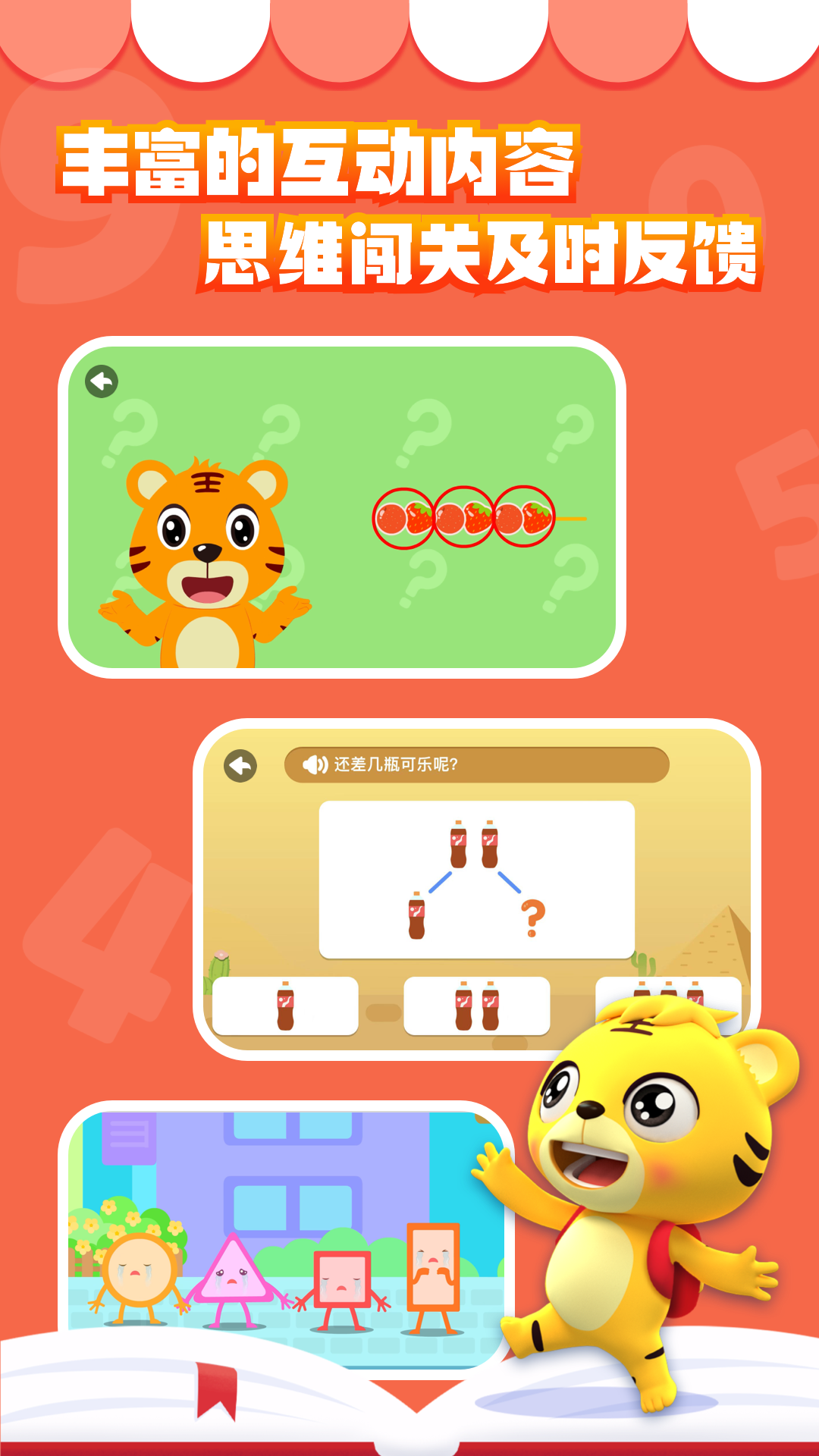由浅入深阶梯式科学培养。通过快乐儿歌、趣味互动等生动形式,结合儿童熟悉的日常生活场景,让孩子在快乐中锻炼思维,养成勤于思考的好习惯。《贝乐虎数学》以蒙氏(蒙特梭利)教育法作为理论依据,将生活中无处不在的情景融入到轻松易懂的互动情景中,让孩子更容易理解。