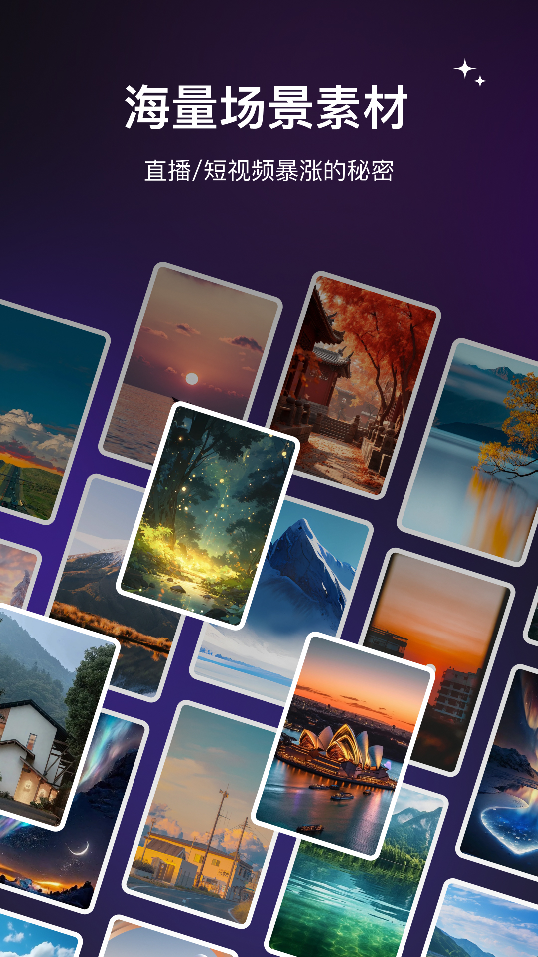 软件内提供了海量素材、直播间模板、多场景切换、多图层搭建、强大美颜、智能遥控、背景音乐音效、多机位投屏、多平台推流直播等功能,让你用一部手机就能轻松搭建明星大牌同款虚拟直播间!