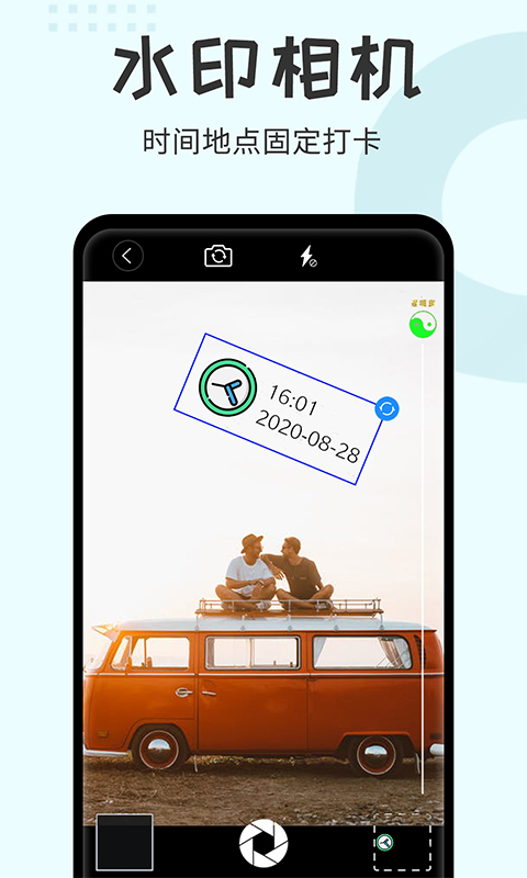 【水印相机】:选好水印、一键拍照,水印照片自动生成;水印相机样式丰富多彩,让你的照片更时尚,朋友圈更出彩;爱美爱自拍就用水印大师相机!