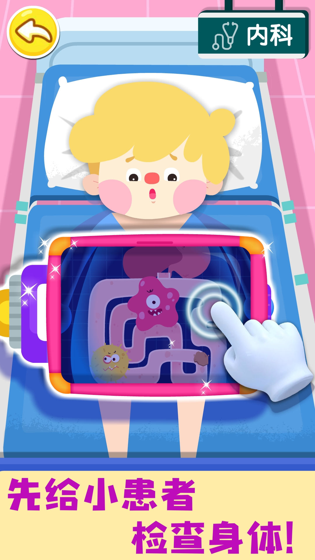 病人很不舒服,用扫描仪检查看看,哎呀,是喉咙里面有异物。另一位病人头晕,快看看怎么回事?用血压计量一量,原来是血压过高导致的头晕。