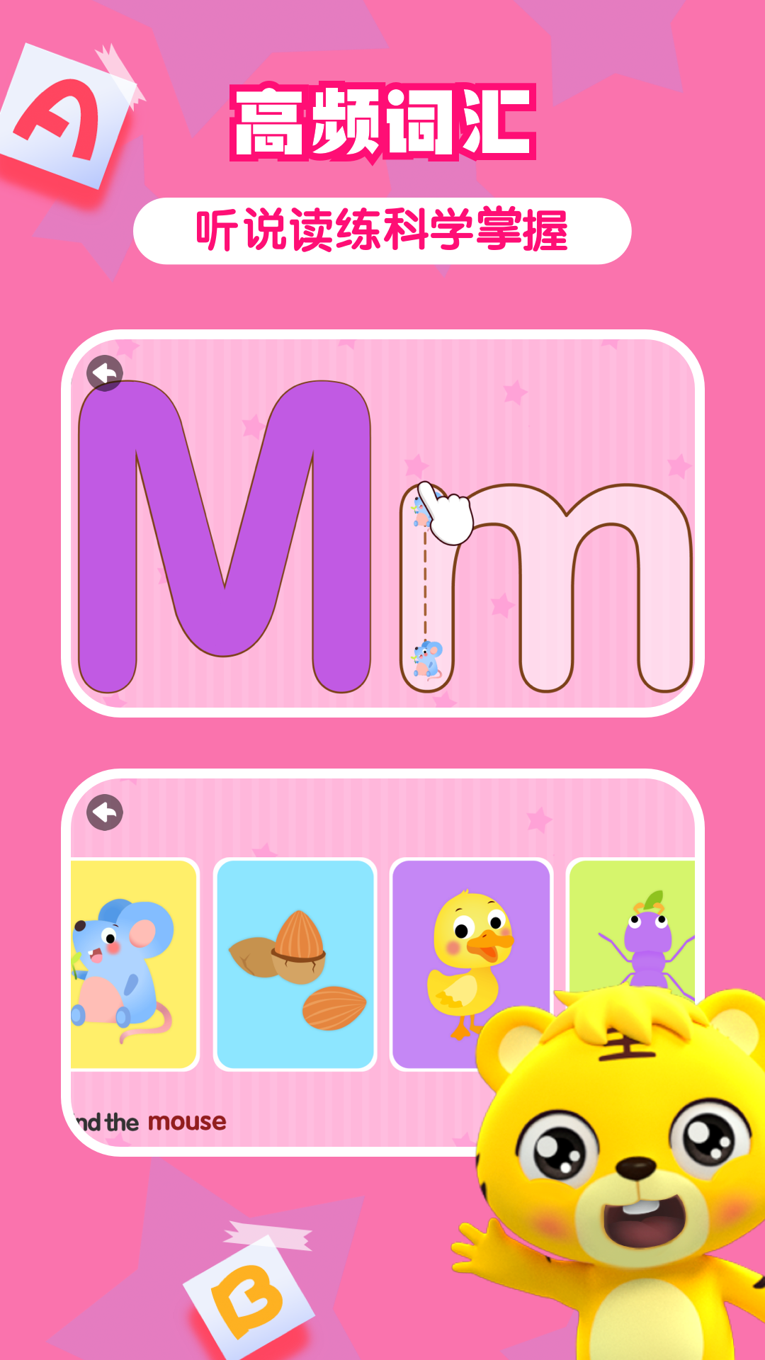 以动画和互动的形式为载体,遵循儿童的认知发展规律,螺旋式巩固,从字母到单词逐步铺垫过渡,使儿童在玩耍的过程中积累对字母和单词的认知,让儿童爱上英语,在兴趣中成长。