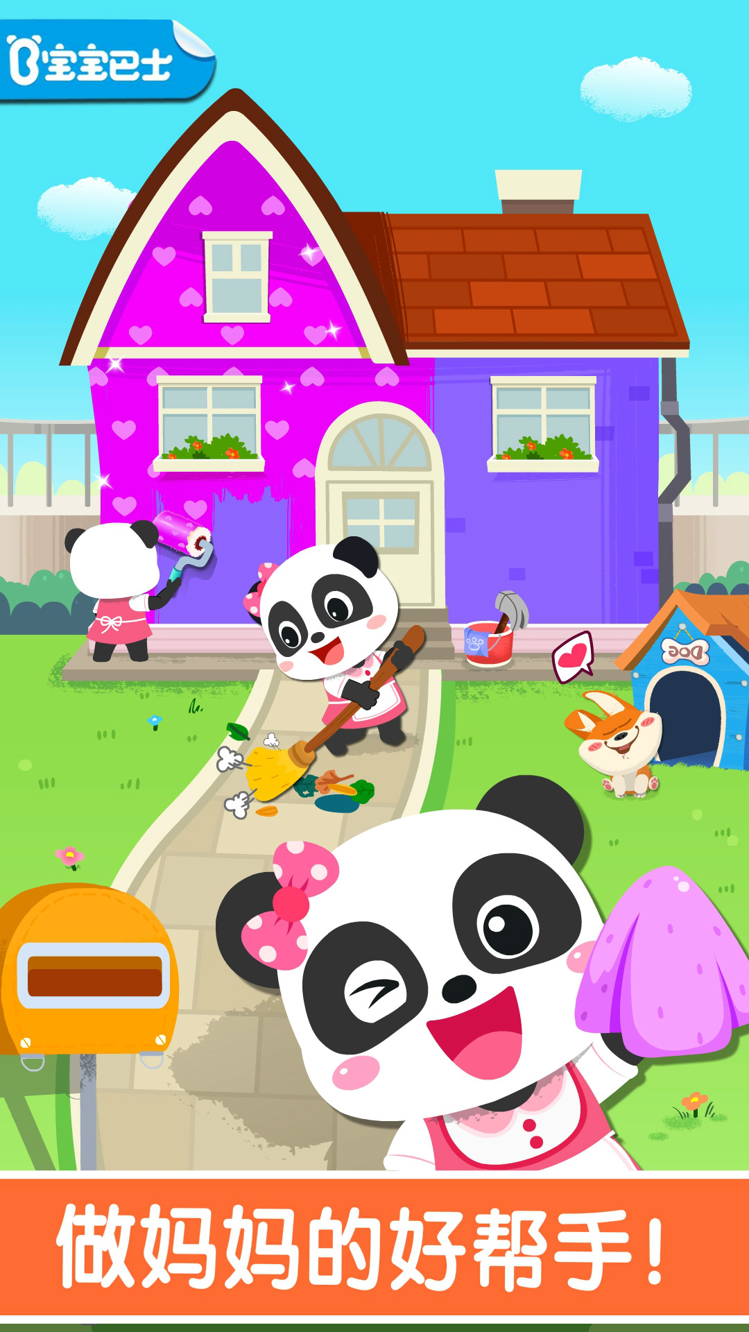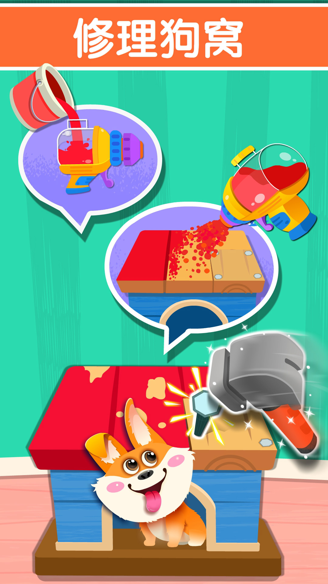 小狗的房子坏了,快帮他修好房顶,再刷上漂亮的油漆,小狗看见好开心;清理破掉的墙纸,挑一张粉红墙纸贴上,家里变得好温馨!(激发宝宝创造力)
