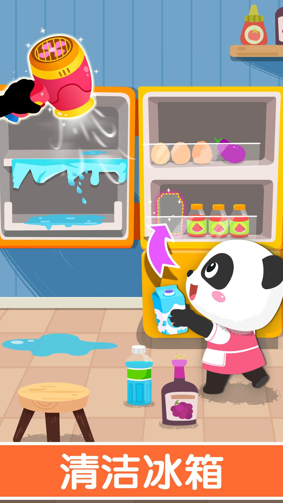 冰箱里结满了冰,不能放食物了。清理冰块,把水擦干,再把饮料,肉类,蔬菜等分类整理好!(锻炼宝宝归类整理的能力)