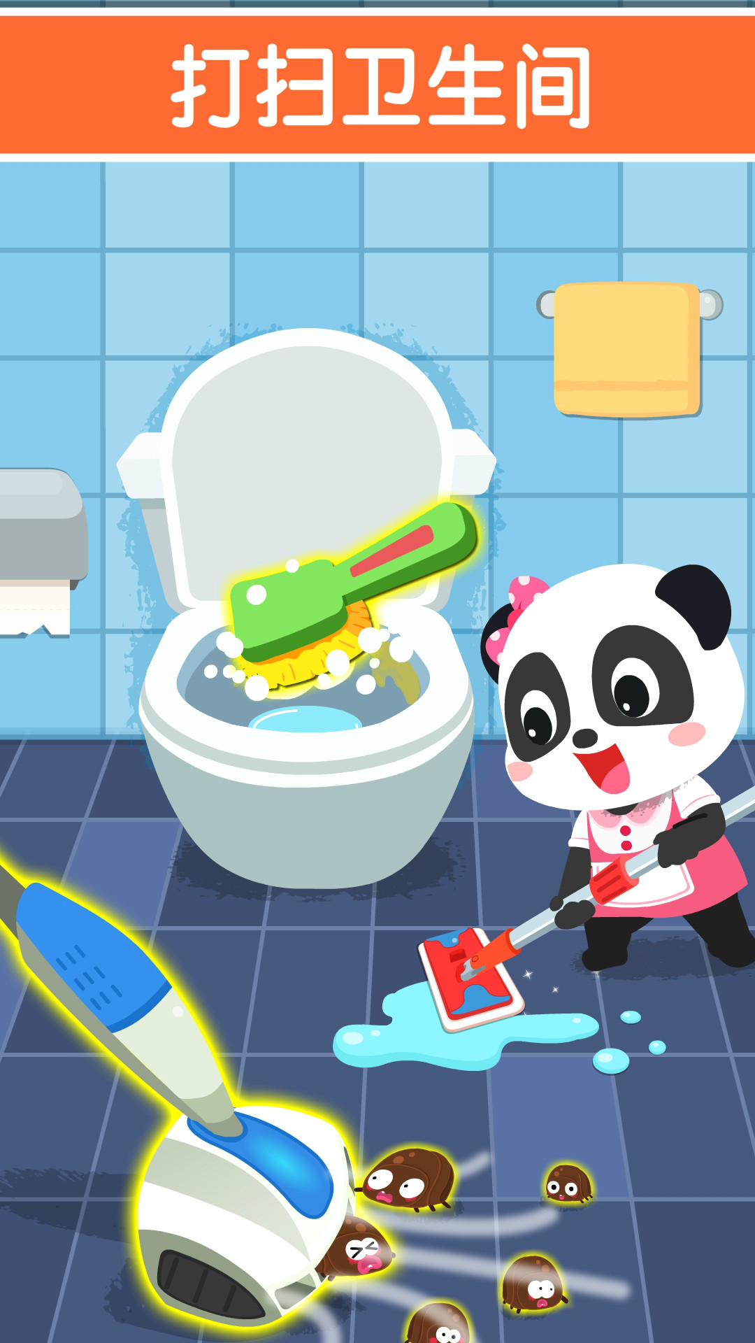 卫生间里好脏,快来打扫一下!清理讨厌的小虫子,再给马桶喷上清洁剂和杀菌药水,刷完一按冲水建——咦,水下不去?原来是水管坏了,宝宝快来接好它!(锻炼宝宝脑力)