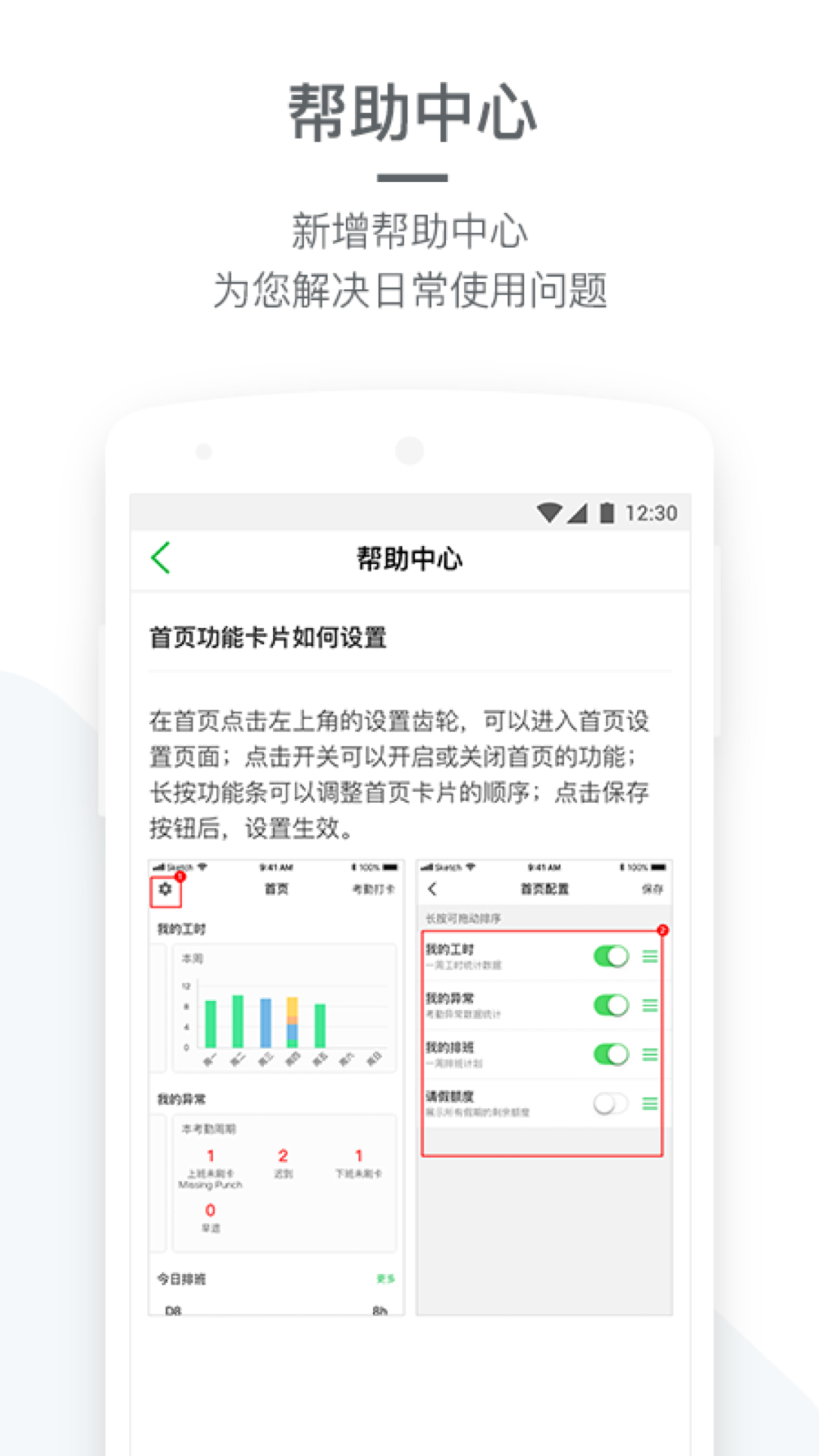 4.迟到、早退、漏打卡等出勤异常实时推送、快速申诉,提前解决问题