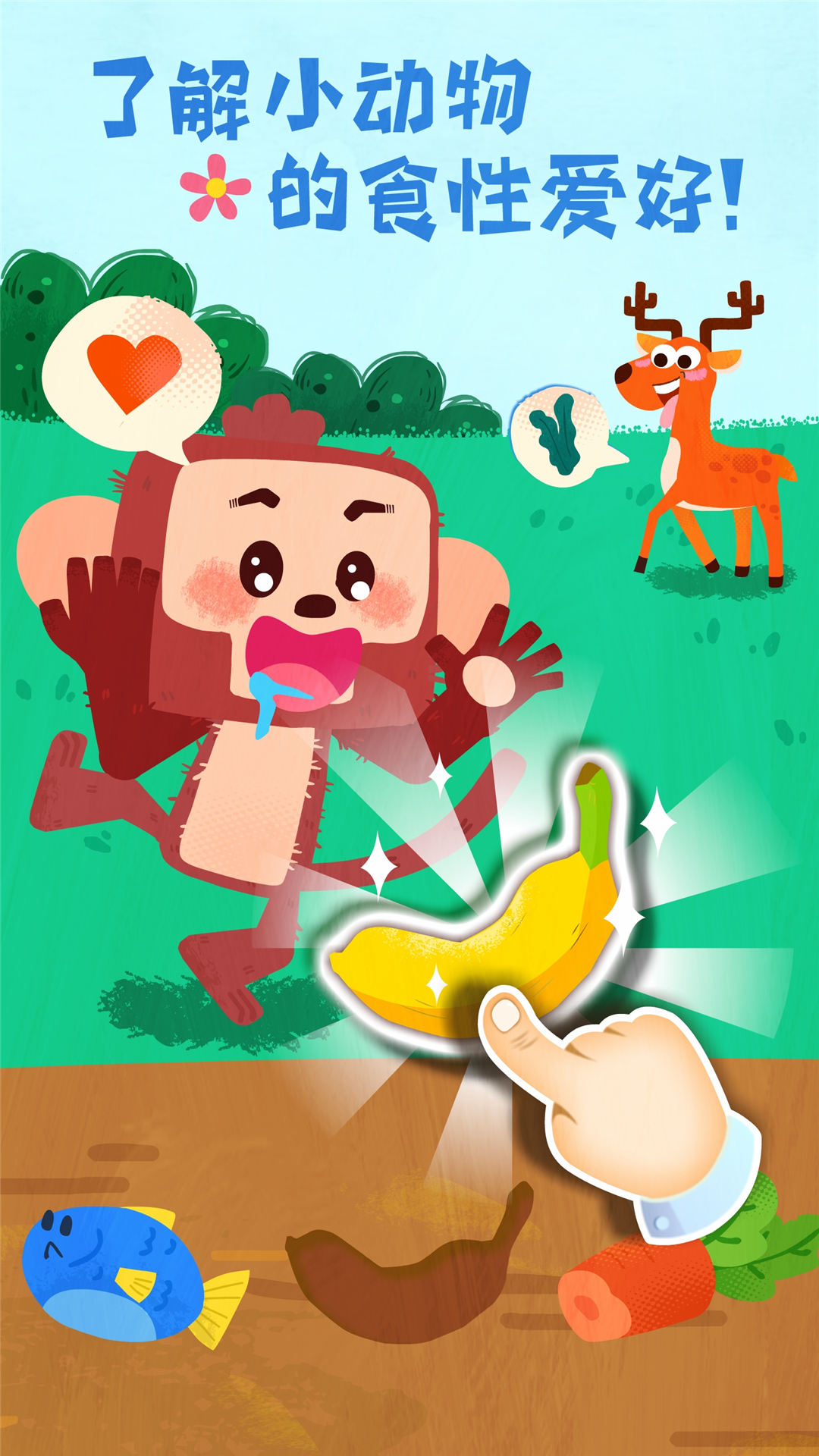 小动物肚子饿了,宝宝给它们喂食吧。挑选玉米和胡萝卜,喂给梅花鹿吃。斑马喜欢什么食物呢?树叶or小鱼?宝宝想一想。