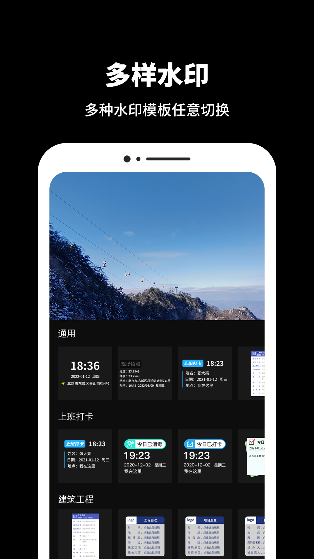 经纬相机是一款工作拍照水印相机,拥有时间地点水印、工程水印、天气水印、工作打卡水印等一系列水印贴纸任您挑选。操作极简只需一拍便立马可生成水印,傻瓜式操作让你不再纠结!