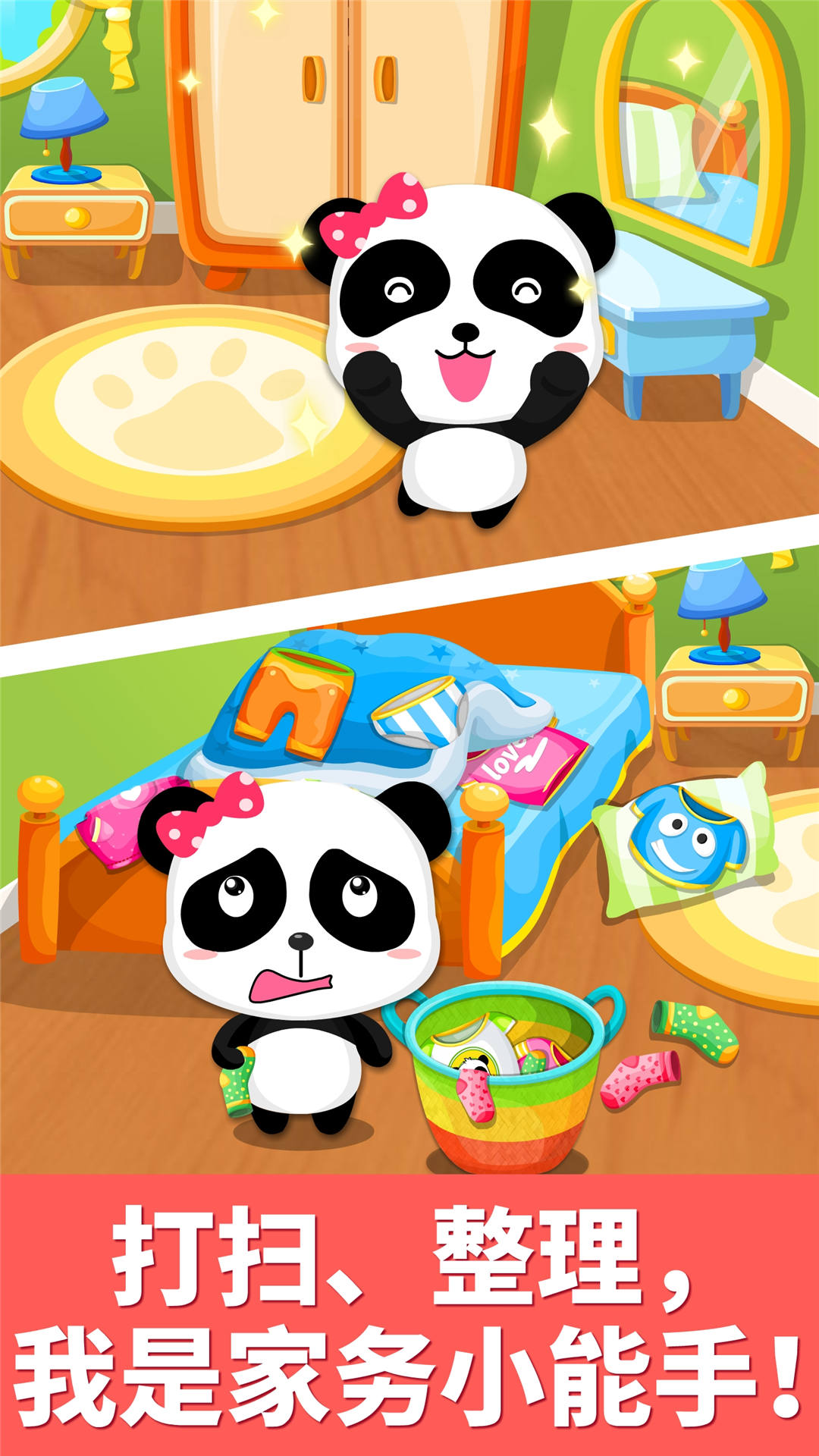 整理床铺咯,脏衣服放进衣篓,布娃娃放回原位。打开衣柜,分类整理上衣、短裤和袜子。用吸尘器呼呼呼,吸走纸屑和灰尘,地板变干净啦。
