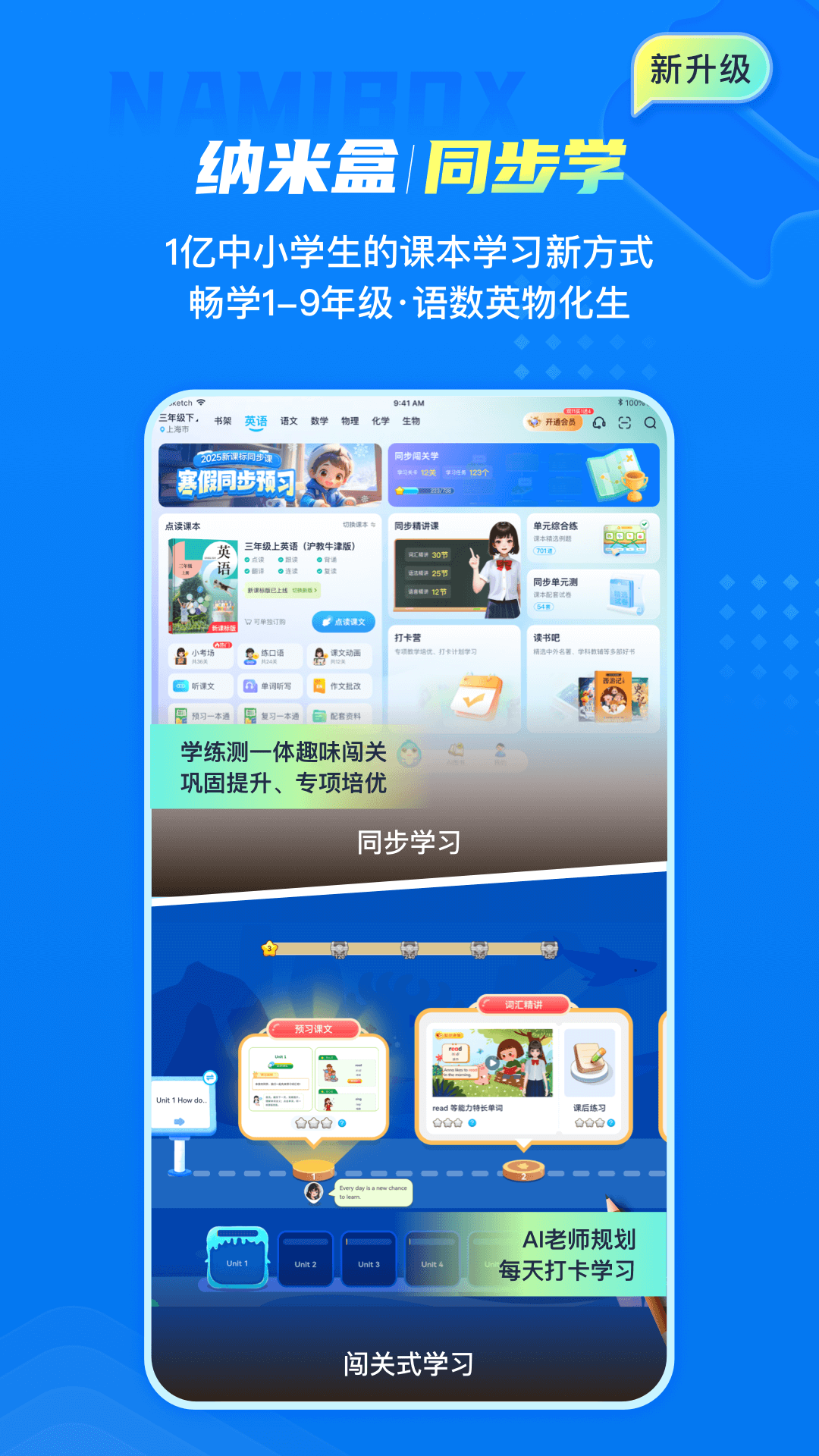 纳米盒,AI时代的学习神器!专研数字教科书与同步智能教辅12年,一款面向中小学生的课本同步闯关学APP。覆盖语、数、英、物、化、生六大学科,1:1同步全国主流教材,科学设计每一课学习路径和学习内容,一站式搞定孩子预习、复习、练习、培优所有学习场景,帮助学生建立系统的知识体系,提升综合能力与自主学习能力。