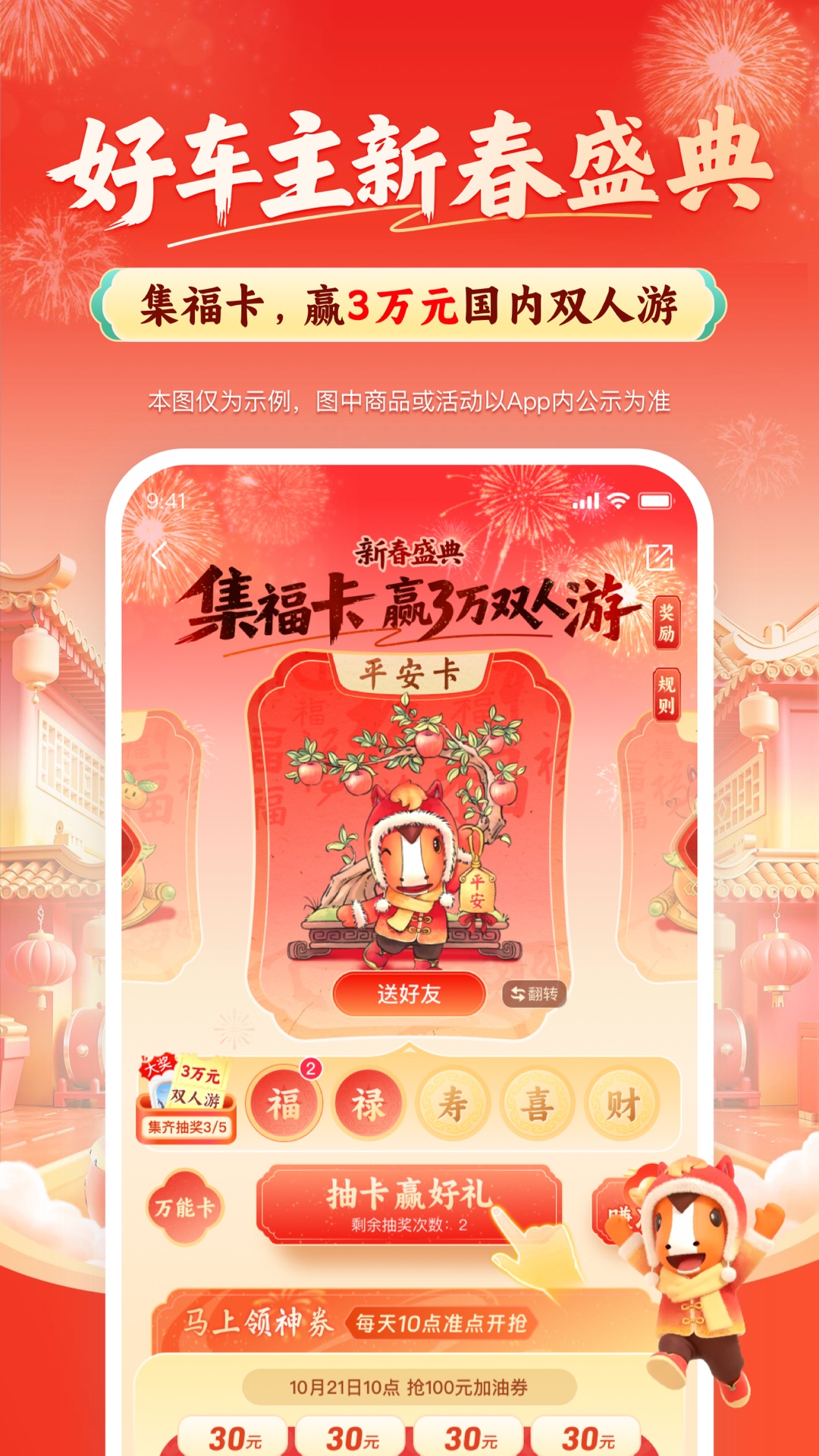 1、【好车主新春盛典】好车主新春盛典,集福卡,赢3万元国内双人游,保险低至72折起,天天抢100元加油充电券。