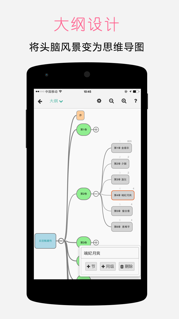 壹写作思维导图式的大纲设计使您能够在长时间内将不同的灵感进行多维度灵感,自如地合并,分解,调整每个细节在作品中的位置,使最终生成的作品更加严谨。
