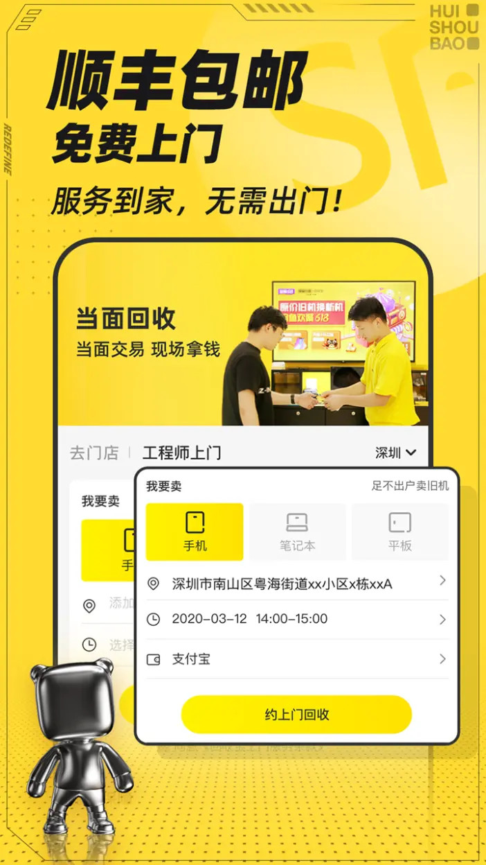 回收宝-阿里巴巴战略投资! 专业的电子产品回收平台,高价回收闲置二手手机、笔记本电脑、平板电脑!支持邮寄回收、上门回收、到店回收等多元化回收场景。 快速估价、专业检测、到账及时,优质的团队提供高价回收服务,并有数据粉碎、隐私安全保障。 【服务优势】 信用回收:先收钱后回收,下单立刻收款! 高价回收:旧机换钱,回归价值! 以旧换新:正品新机,品质保证! 顺丰包邮:服务到家,无需出门! 快速收款:确认回收,当天付款! 隐私清除:信息清理,不留痕迹! 【联系方式】 官方网址:https://www.huishoubao.com/ 官方微博: https://weibo.com/huishoubao(@回收宝) 官方微信:hsbTech (回收宝) 客服电话:400-080-9966 合作QQ:118 69 678 合作邮箱:BD@huishoubao.com.cn