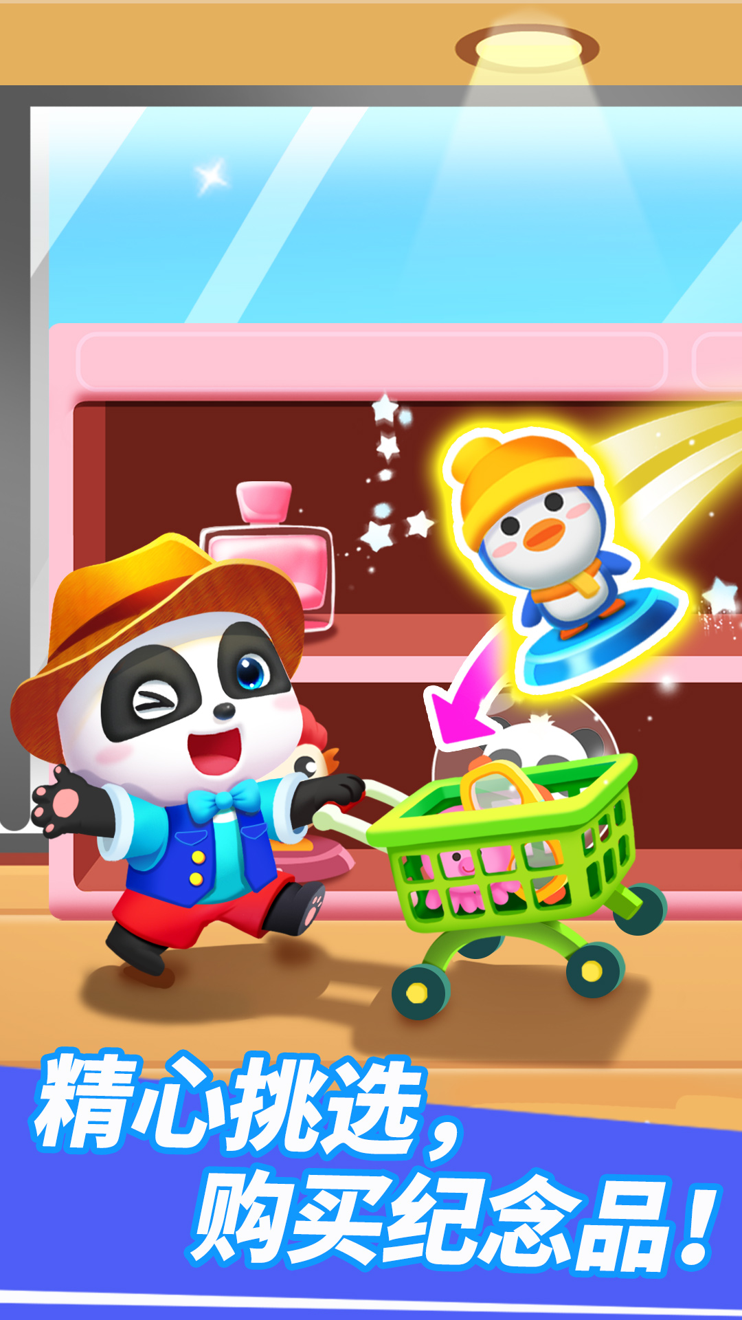 机场商铺升级,快去逛逛。在服装区,各色服装自由选;精选零食区,丰富美食满足味蕾期待;还有纪念品,企鹅摆件、熊猫水晶球……宝宝可以任选。