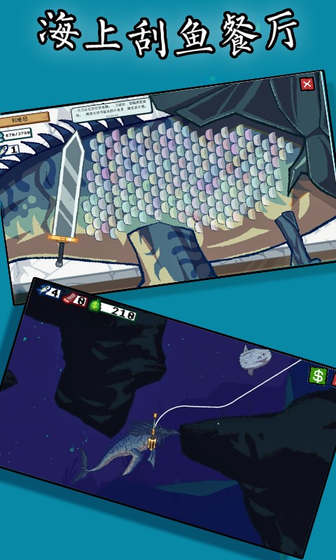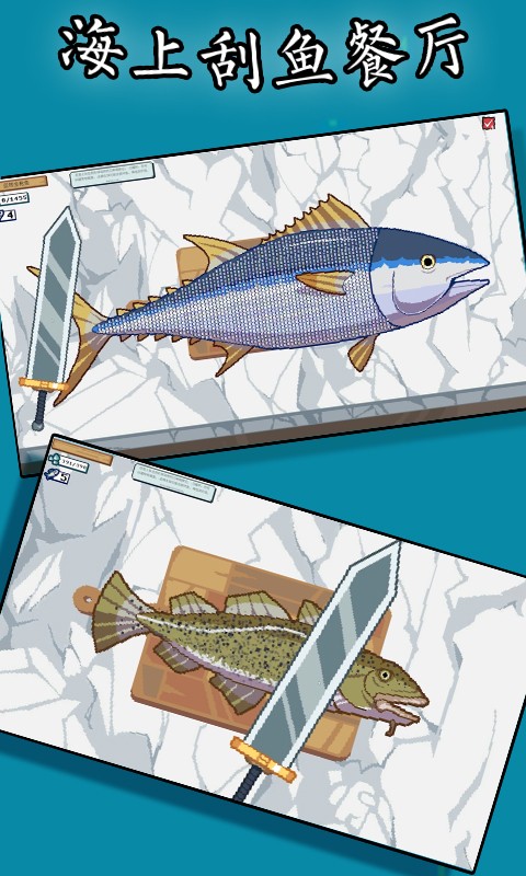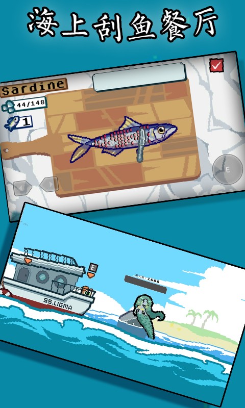 一款趣味好玩的休闲益智游戏。该游戏是由玩家自制而来的像素游戏。游戏中玩家将扮演一名海上餐厅的老板,需要不断的在海上进行捕鱼,然后为客人烹饪出可口的食物。从而获取游戏中需要的金币资源,接着利用这些资源,升级自己的刀具等物品,从而可以制作出更多美味的食物,吸引更多的客人,如此往复。玩家还可以在游戏中体验刮鱼鳞的趣味。