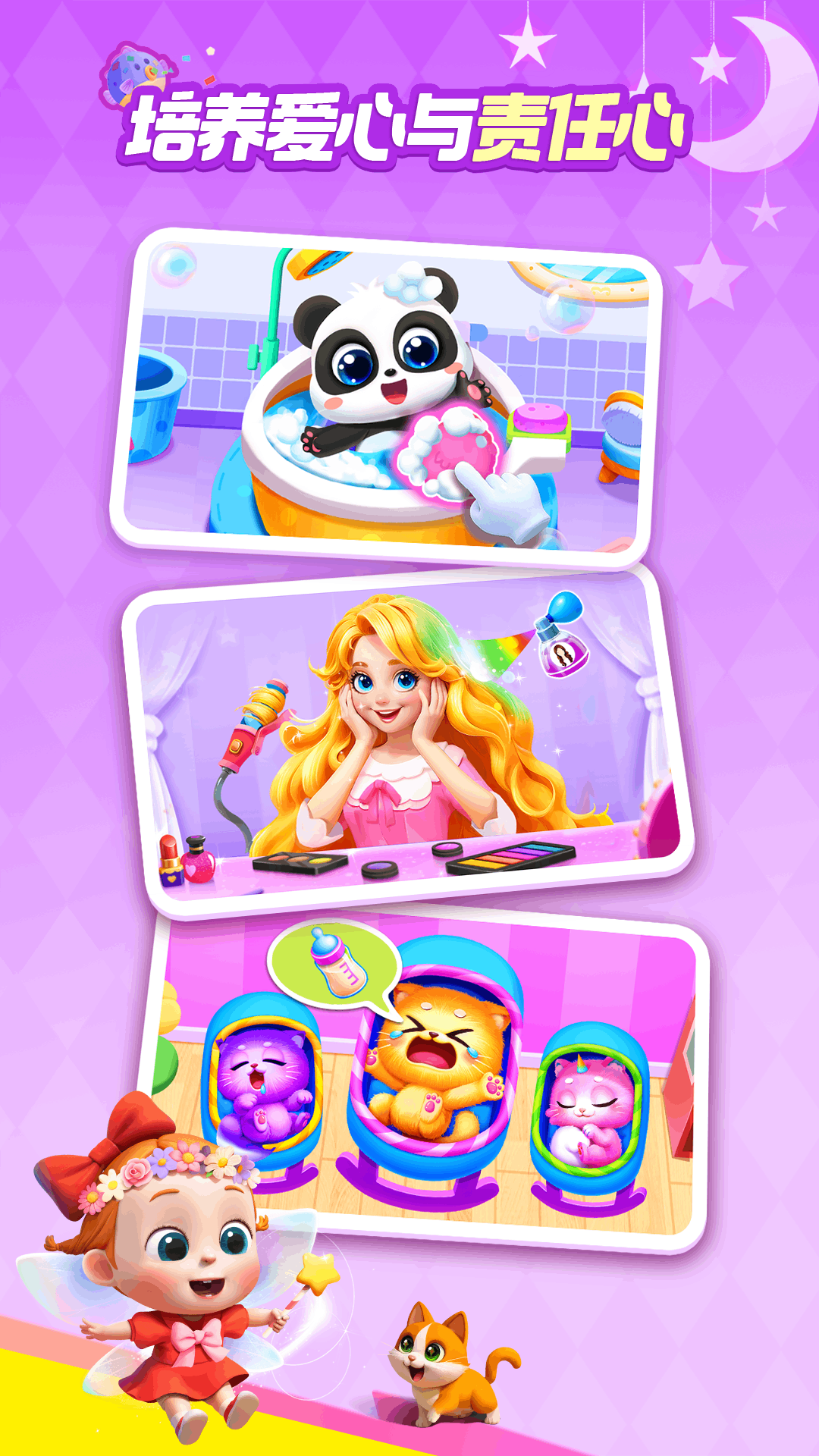 设计《手工调色》《魔力画笔》《涂色画本》等艺术启蒙互动,鼓励宝宝自由涂鸦绘画,感知色彩。引导宝宝在《公主宠物城堡》《时尚设计师》互动中,设计百变造型,提升创造力与审美力。