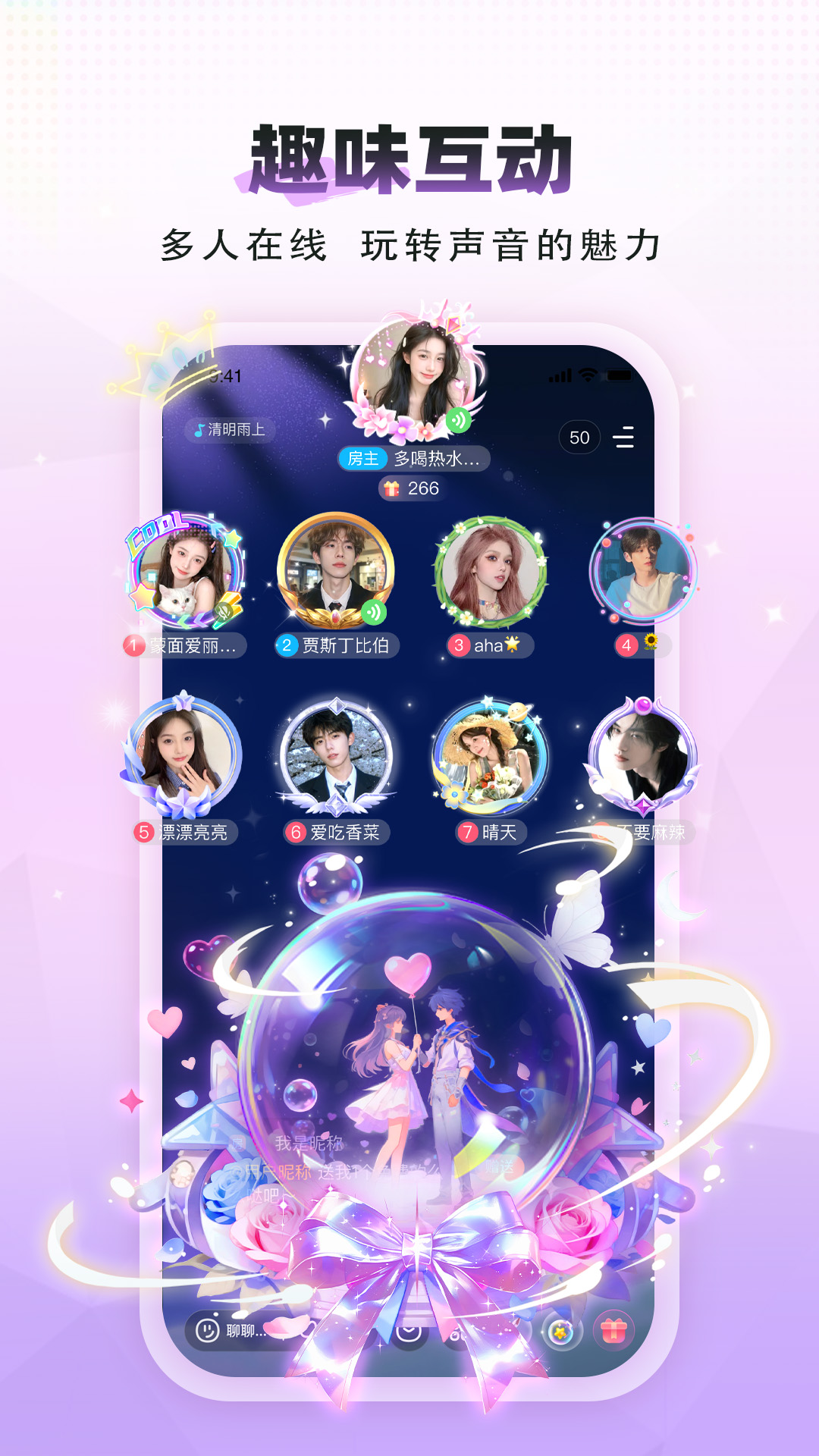 你喜欢的声音这里都有。相亲脱单、娱乐、K歌、pia戏,海量主题语音房,每天都有新主题,告别孤独,嗨翻全场!