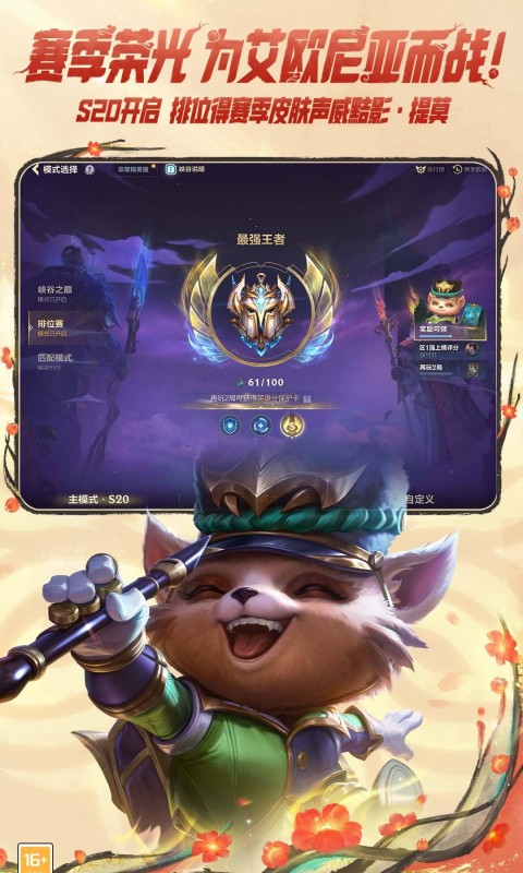 热门英雄——斯莫德、梅尔将陆续降临峡谷,为战局注入更多战术可能。S20赛季开启,参与排位即可获得赛季限定皮肤“声威黠影 提莫”。符文大乱斗开启飞剑新赛季、双人竞技场超多新内容、首个乐斗专属皮肤来袭!还有多款手游原创皮肤上新,闪耀峡谷!准备好在这片崇尚内在力量与和谐共生的土地上,书写新的传奇了吗?
