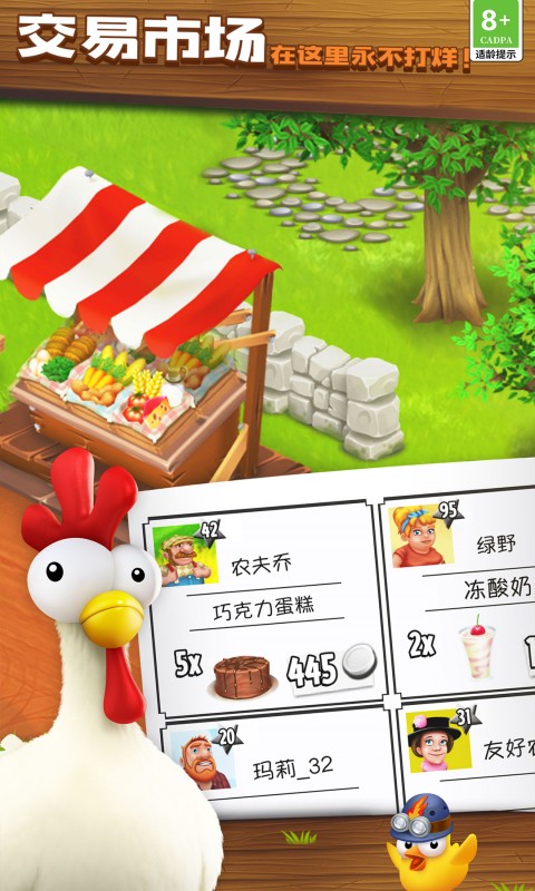 轻松经营农场,收获无限欢乐!您可以在农场里种植小麦和玉米等作物,即使从不下雨,它们也能茁壮成长。收割后继续播种,收获更多作物,再将作物加工成产品出售。随着农场的发展壮大,您还可以饲养母鸡、猪、奶牛等动物!给动物喂食,收集它们产出的鸡蛋、培根、牛奶等农产品,再利用这些产品来赚取金币,比如与其他农场主交易、完成卡车订单等。