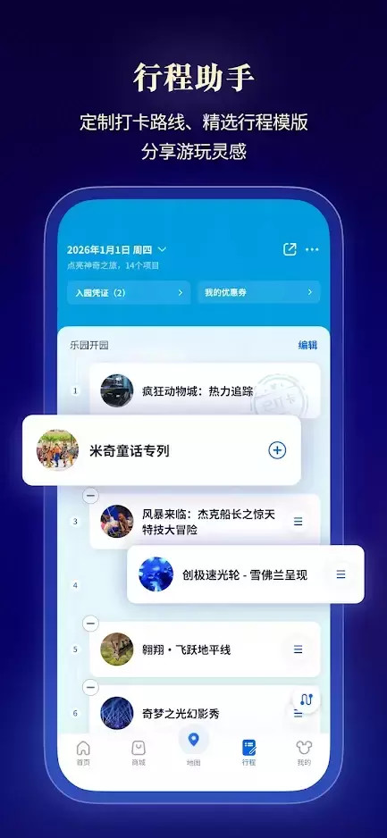 下载上海迪士尼度假区官方App,提升您的游玩体验!轻松购票,在线领取“迪士尼预约等候卡”或购买“迪士尼尊享卡”,实时查看游乐设施预计等候时间及娱乐演出安排,浏览交互式地图及其他事项。