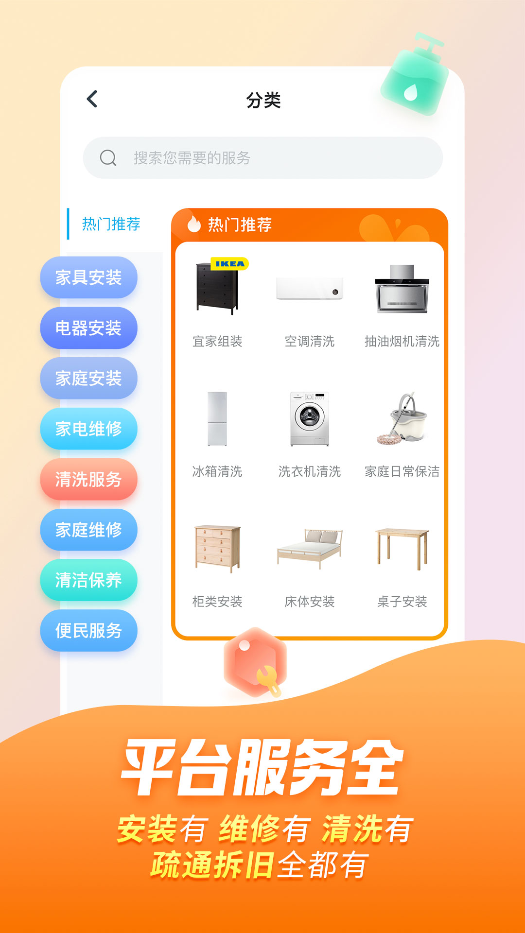 万师傅APP,是万师傅旗下专为C端家庭及个人用户提供上门安装上门维修管道疏通家电清洗家庭保洁甲醛检测家具家电拆旧搬货速运等居家生活便民服务的APP,万师傅平台成立于2013年,8年间累计家庭服务7000万次,全国累计师傅数180万+,专业、优质、有保障的,随叫随到,解决您生活中的小麻烦。【主营服务】上门安装-宜家组装/家具安装/家电安装/电路灯具安装/电视挂墙/厨卫洁具安装/水管龙头安装/晾衣架安装/门窗五金安装/等上门维修-空调维修/电视维修/热水器维修/厨房家电维修/生活电器维修/电路维修/水管维修/乐器维修等家电清洗-油烟机/空调/洗衣机/热水器/冰箱/消毒柜/微波炉/燃气灶家庭保洁-日常保洁/深度保洁/新居开荒/玻璃清洁/全屋收纳/四害消杀等家居保养-家具贴膜/家具保养/地板打蜡/瓷砖美缝/大理石护养/床垫清洗/沙发清洗/地毯清洗等甲醛检测-甲醛检测/甲醛治理管道疏通-马桶疏通/地漏疏通/洗菜盆疏通等拆旧服务-家具拆旧/厨卫洁具拆旧/家电拆除/电路灯具拆除/门窗拆除/墙体拆除等生活便民-锁安装/人力搬运/拉货等