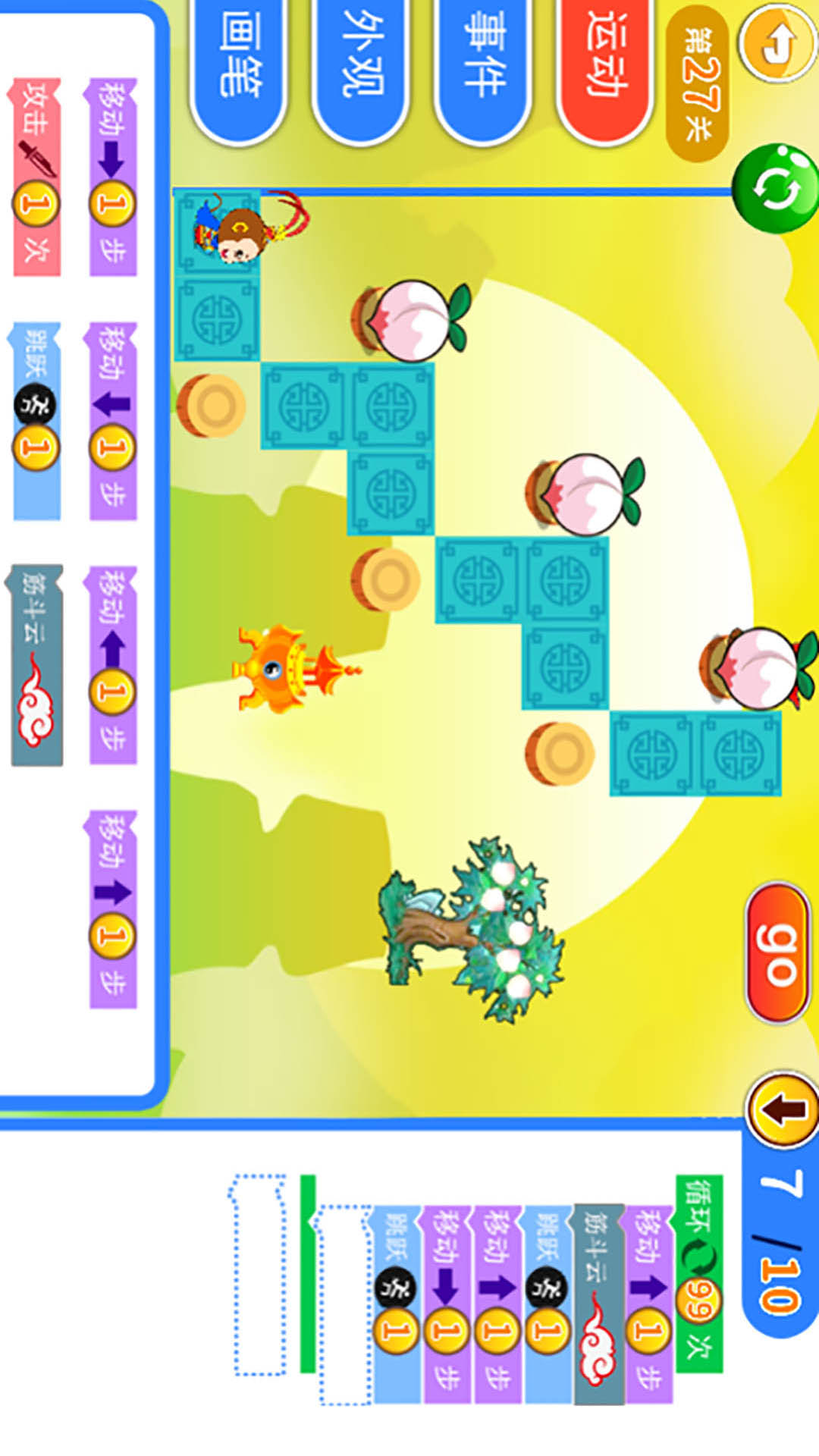 【寓教于乐】通过悟空一行西游取经的故事,通过搭建程序积木块,实现移动、攻击打怪、解救师傅等环节。寓教于乐,轻松学编程。