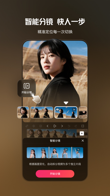 多种视频剪辑功能,包括视频分割、裁剪、拼接、倒放、添加常规/曲线/自定义变速、转场、添加封面和片尾等,帮助用户快速完成视频剪辑。