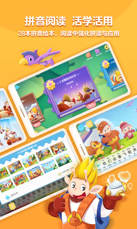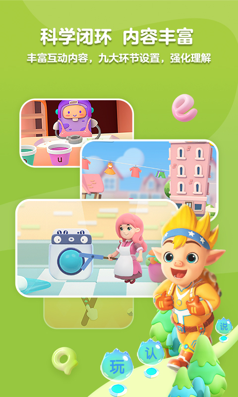 结合拼音音形设计丰富的创意互动场景,动画、儿歌等多种形式相结合,玩、调、读、说、拼等9大环节,让孩子更好的理解拼音。